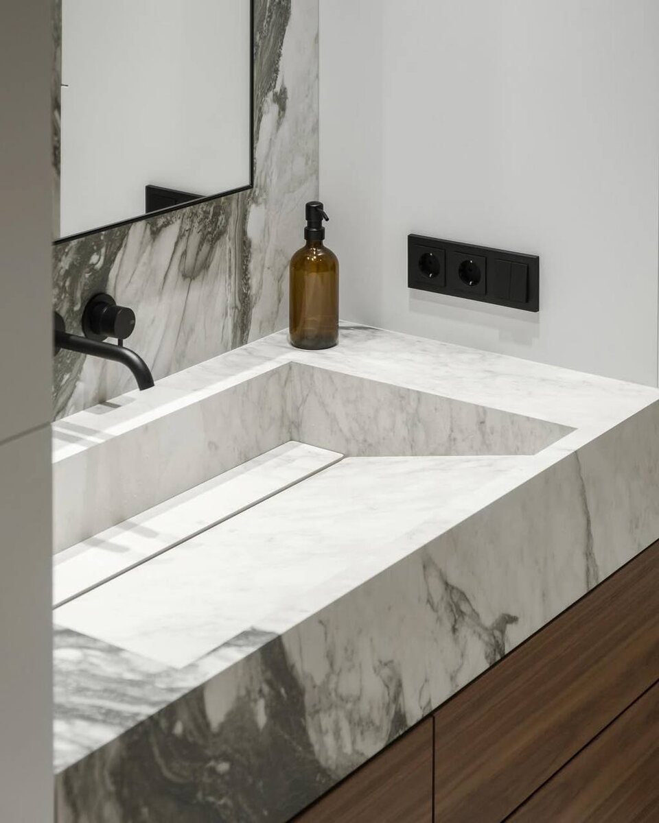 Гостевой санузел в ЖК «Садовые Кварталы». Простой, но очень элегантный. Ещё на этапе разработки мы вдохновились этой шикарной текстурой камня, но в жизни он выглядит ещё эффектнее.🤍 — Project: #SDVE_160 Year: 2025 Location: Moscow — +79037959696 Info@wowroom.ru #wowroomdesign —