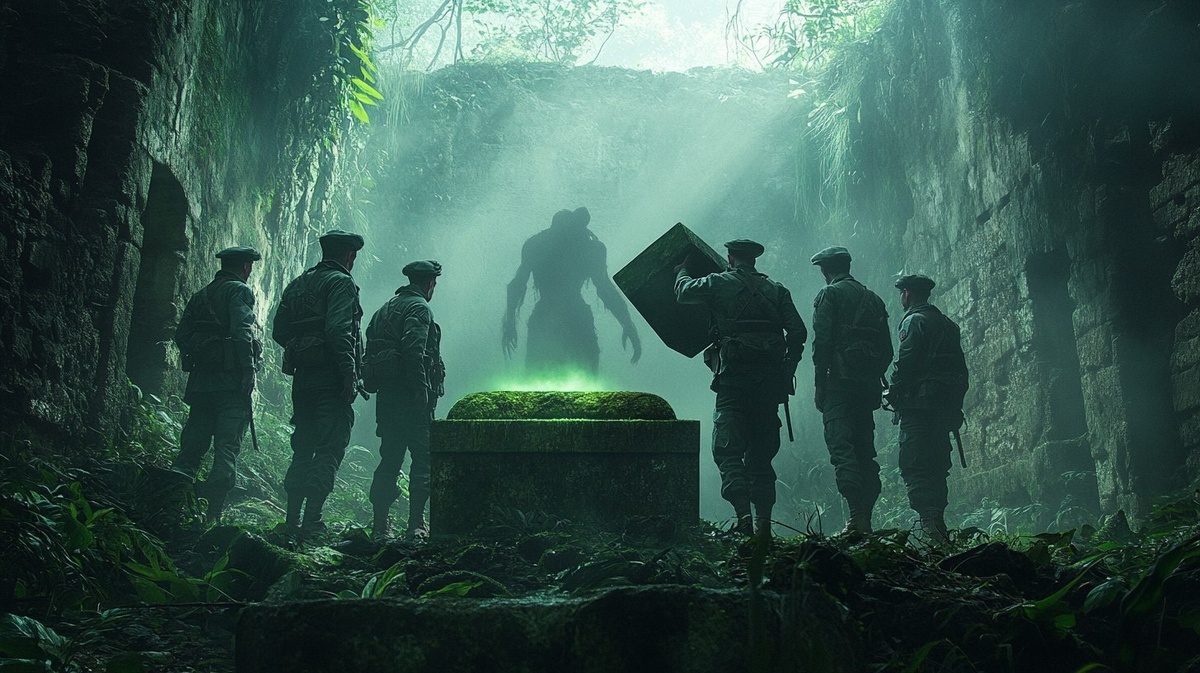 Создано на основе запроса: A group of five tired soldiers in worn Colombian military uniforms from the WWII era stand inside the overgrown ruins of a forgotten jungle village. One soldier is lifting the heavy lid of a moss-covered stone coffin, and a soft, unnatural green glow escapes from within. Thick jungle vines hang from the crumbling stone walls, and a cold mist surrounds their boots. Just behind them, a shadowy figure with elongated limbs and glowing eyes is slowly forming from the darkness --- Автоперевод: Группа из пяти уставших солдат в изношенной колумбийской военной форме из эпохи Второй мировой войны стоит внутри заросших руин забытой деревни джунглей. Неплохо вышло? 🤔 https://dzen.ru/id/65c0c65c86e4f837c27b24d7 #ИИ #AI #нейросеть #midjourney #art