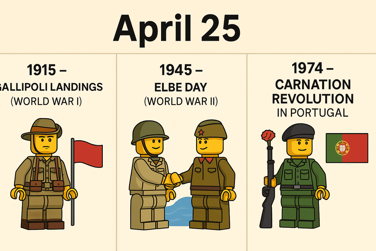 25 апреля 1915 года началась высадка войск Антанты на полуострове Галлиполи. Австралийские и новозеландские солдаты (ANZAC) столкнулись с ожесточённым сопротивлением турецких войск. Операция завершилась неудачей, но стала символом мужества и жертвы для Австралии и Новой Зеландии. С тех пор этот день отмечается как ANZAC Day, день памяти всех павших воинов . 25 апреля 1945 года в районе города Торгау на реке Эльба встретились советские и американские войска. Это событие символизировало окончательное разделение нацистской Германии и стало важным шагом к завершению Второй мировой войны . В этот день началась мирная военная революция, положившая конец диктатуре в Португалии. Младшие офицеры армии свергли режим Марсело Каэтано, что привело к демократическим реформам и завершению колониальных войн. Революция получила название «Революция гвоздик» из-за того, что солдаты вставляли гвоздики в дула своих винтовок .