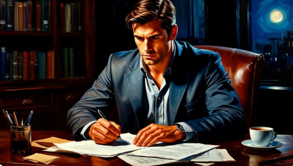 Андрей Осокин задержался в кабинете после ухода Дмитрия. Его стол был завален бумагами. Осокин склонился над записями разговора с Дмитрием, отмечая ключевые моменты: