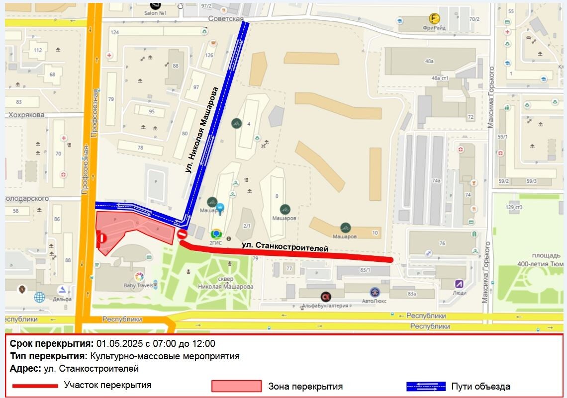 1 мая на время перекроют движение В связи с проведением торжественного мероприятия 1 мая в период с 07 до 12 часов будет прекращено движение транспортных средств на проезде к автомобильной дороге по ул. Станкостроителей – от ул. Профсоюзной до здания № 2 по ул. Николая Машарова. Всем участникам дорожного движения рекомендуем обращать внимание на знаки, соблюдать Правила дорожного движения РФ. Схема объезда: ул. Профсоюзная.
