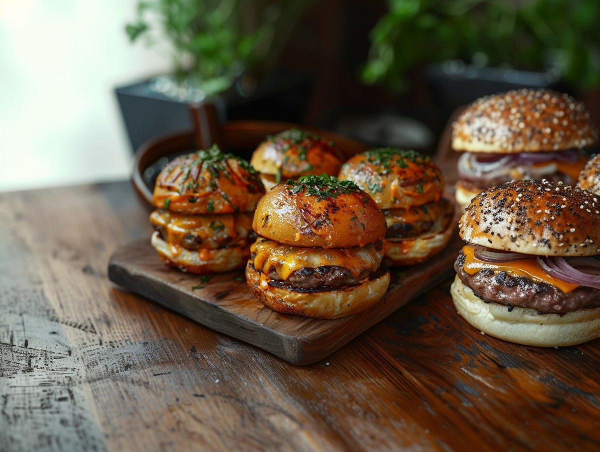 Создано на основе запроса: Three burger sliders served on a rustic wooden board, each topped with cheese and drizzled with bright orange sauce, golden toasted brioche buns, Studio Lighting, Constructed Framing, natural lighting, depth of field, front view