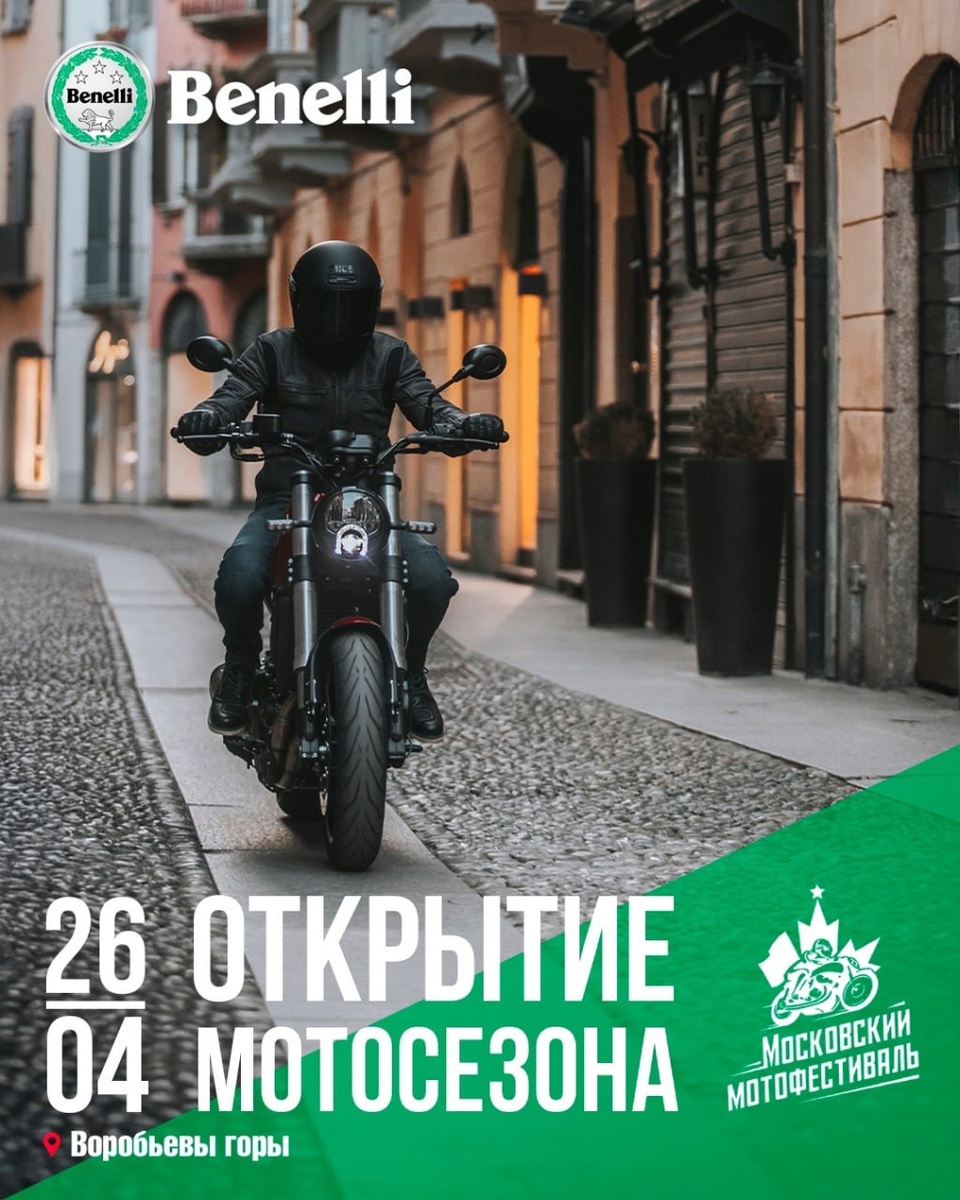 26 апреля на смотровой площадке Воробьевых гор пройдет 12-й Московский мотофестиваль, посвященный открытию мотосезона 2025! Приглашаем вас и ваших друзей присоединиться к нам — Benelli ждет вас! Вас ожидает захватывающая программа с выступлениями артистов и множеством интересных событий. Приходите к нашему стенду, познакомитесь с брендом Benelli! Все желающие смогут ознакомиться с моделями поближе и узнать подробности. 📍 Место встречи: смотровая площадка «Воробьёвы горы». 🕙 Начало фестиваля: 10:00, старт мотопробега в 12:00, окончание мероприятия в 18:00. 🎫 Вход свободный! До встречи на дороге с Benelli!