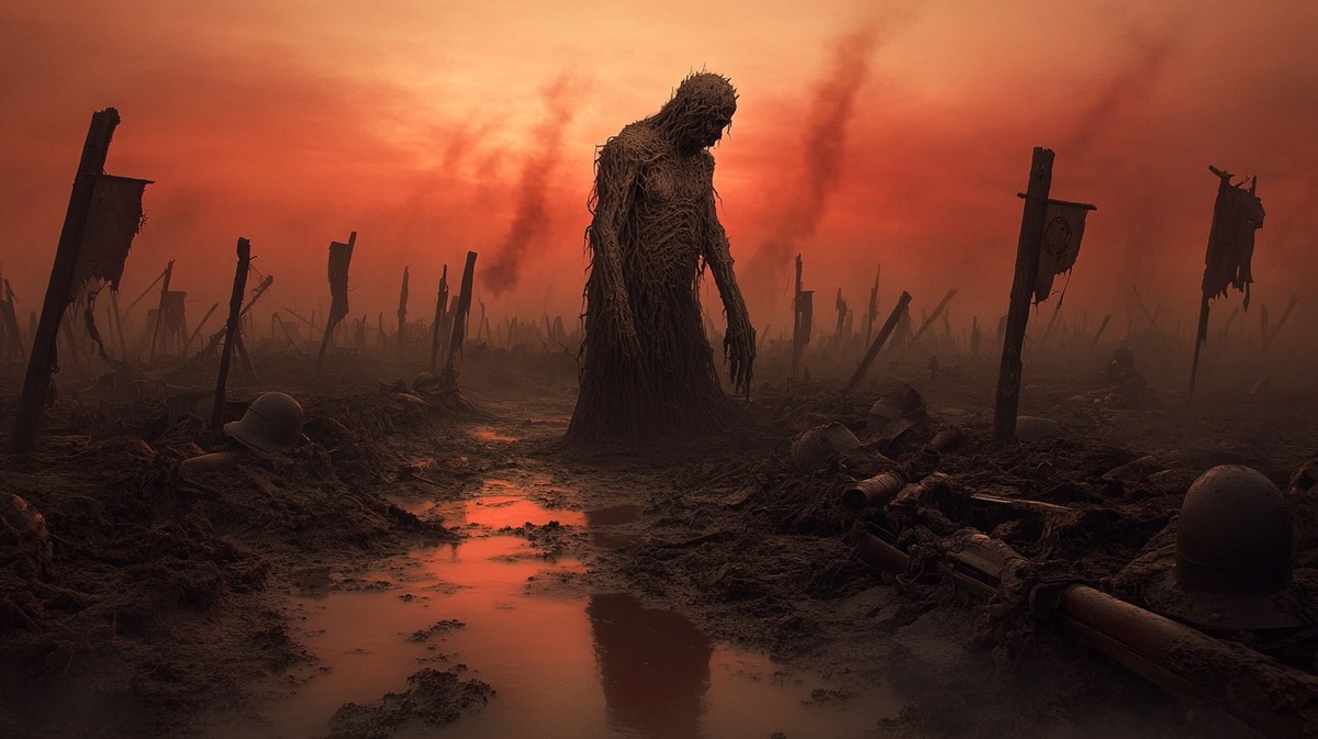 Создано на основе запроса: A vast, endless trench battlefield under a deep red, starless sky. In the center of the scene stands a towering figure made entirely of thick, wet mud, shaped like ancient armor. Its body is covered with rusted military insignias and tattered emblems from different wars across history, embedded into its muddy surface. The figure has no visible face, only a smooth, featureless mass of mud where the face should be. Broken banners, abandoned helmets, and shattered rifles are scattered along the flooded trenches, half-submerged in dark water. A faint mist hovers over the ground, and the distant sound of a low, haunting chant seems to hang in the heavy air. The overall atmosphere is surreal, ominous, and intensely mysterious perfect for a chilling and realistic horror thumbnail. --- Автоперевод: Огромное, бесконечное поле битвы траншеи под темно -красным, без звездного неба. Как тебе эта генерация? 🤔 https://dzen.ru/id/65c0c65c86e4f837c27b24d7 #ИИ #AI #нейросе