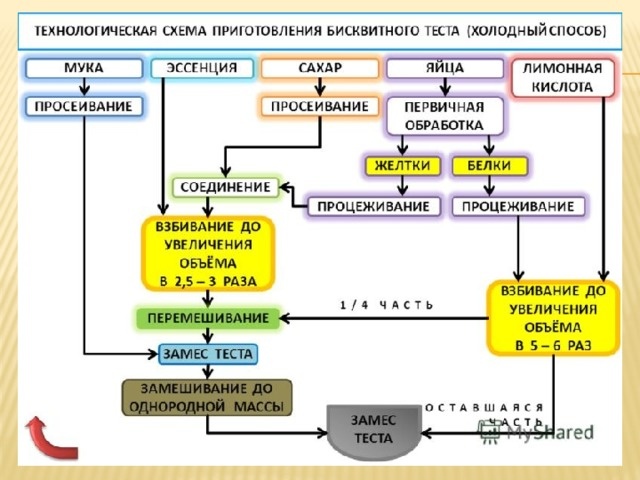 Яйца куриные 4 шт. Сахар-песок1 стакан (примерно 200 г). Мука пшеничная высшего сорта1 стакан (около 150 г). 1. Подготовка ингредиентов Перед началом убедитесь, что яйца свежие и чистые. Сахар и муку желательно заранее просеять для улучшения качества будущего теста. 2. Отделение белков от желтков Аккуратно разбейте каждое яйцо над двумя чашечками, стараясь разделить белки и желтки таким образом, чтобы ни один кусочек скорлупы не попал в миску с белком. Это важно, потому что даже незначительное количество жира сделает процесс взбивания белка неэффективным. 3. Взбивание белков Взбивайте белки миксером на средней скорости до появления стойких мягких пиков. Постепенно добавьте примерно треть всего сахара и продолжайте взбивать до твердых устойчивых пиков. Важно! Белковая масса должна стать гладкой, плотной и глянцевой. 4. Взбивание желтков Отдельно в другой емкости взбейте желтки с оставшейся частью сахара. Добейтесь кремообразной однородной массы светло-желтого цвета. 5. Соединение бе