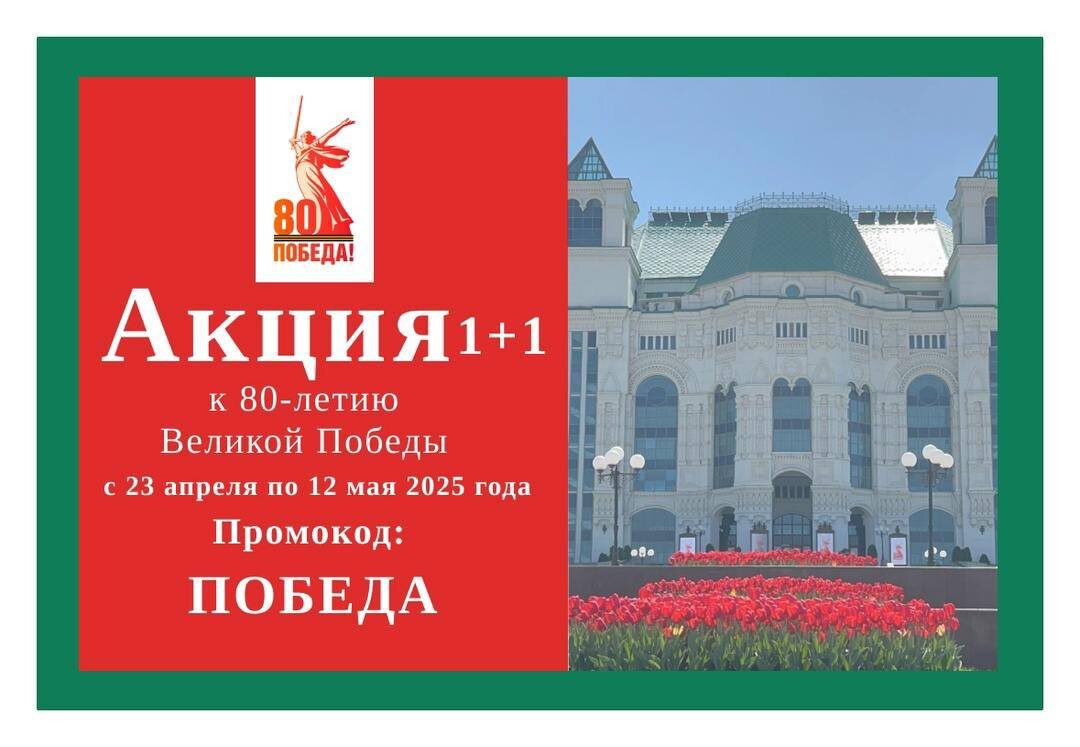 В рамках празднования 80-летия Победы в Великой Отечественной войны АГТОиБ открывает с 23 апреля по 12 мая акцию 1+1. Воспользовавшись предложением, можно приобрести билеты по специальным условиям, применив промокод ПОБЕДА.