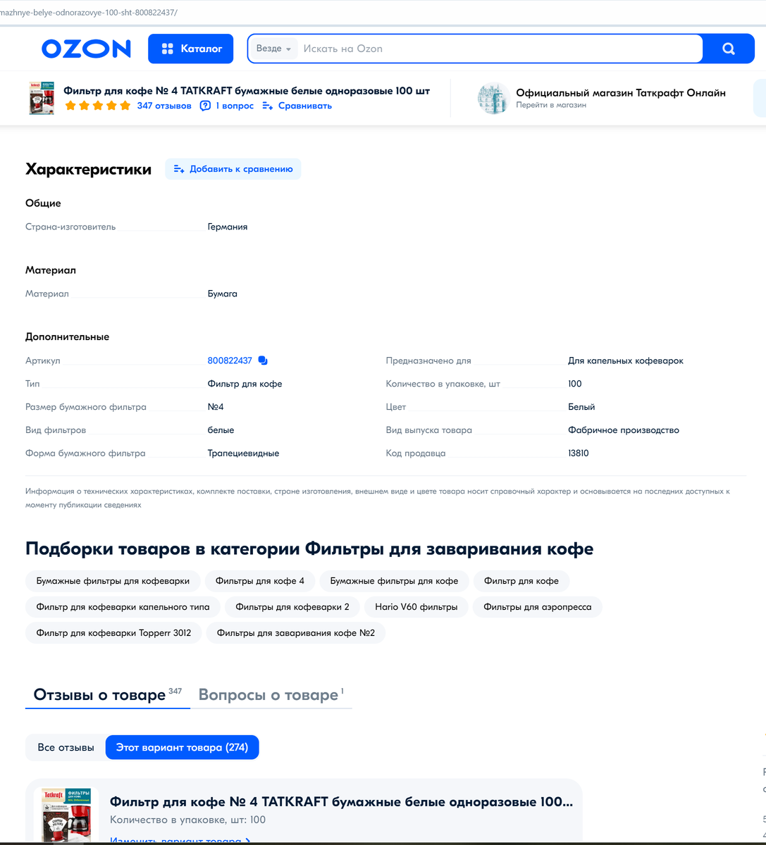 Купили килограмм сушёного шиповника для заваривания в термосе, возникла необходимость в фильтрации. Сами плоды хоть и цельные, но не исключено попадание мелких иголочек из сердцевины непосредственно в кружку, поэтому возникла необходимость купить фильтры. Не только для процеживания шиповника, но спиртовых настоек, может быть кофе, чая. Стал искать что есть, разные формы, разная цена, везде дорого, есть узкие для чая, но они неудобны для заливки из термоса шиповника, поэтому выбрали конусообразные, которые вставляешь либо в кружку, либо в другую широкую ёмкость и наливаешь, в общем купили и не прогадали. Заказали 23 марта 2025 здесь: https://www.ozon.ru/product/filtr-dlya-kofe-4-tatkraft-bumazhnye-belye-odnorazovye-100-sht-800822437/?oos_search=false в Premium-магазине «Официальный магазин Таткрафт Онлайн», за 288 руб называются так: Фильтр для кофе № 4 TATKRAFT бумажные белые одноразовые 100 шт Только заказали, так они закончились, может нам вообще прислали последнюю. Фильтры были в ро