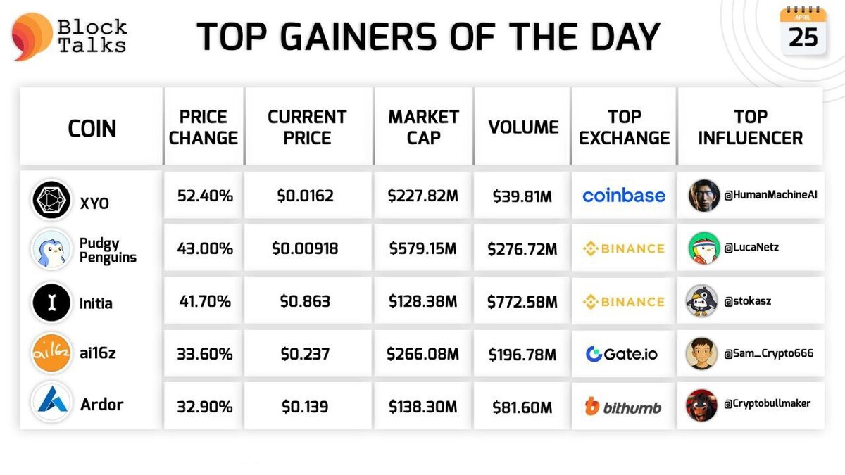 🔸 Лучшие монеты по росту цены 25.04.25