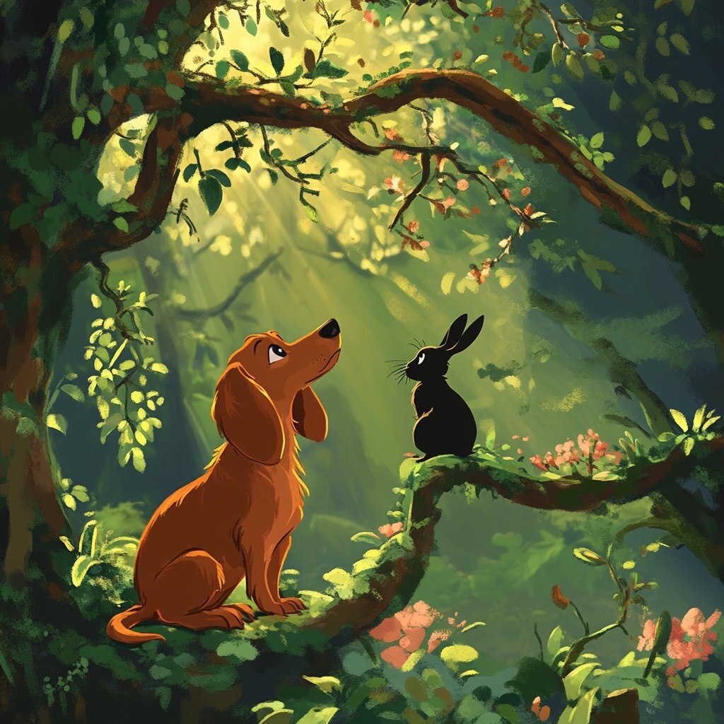 Создано на основе запроса: A charming brown dachshund sitting in a vibrant, magical garden, looking up at a black rabbit perched on a whimsical tree branch, gazing into the distance. The scene is illustrated in the soft, colorful, and richly detailed style of Studio Ghibli, with lush greenery, warm sunlight filtering through the trees, and a gentle, dreamy atmosphere. The characters have expressive, slightly exaggerated features, and the environment feels alive and enchanting. Highly detailed, hand-drawn look, fantasy anime aesthetic
