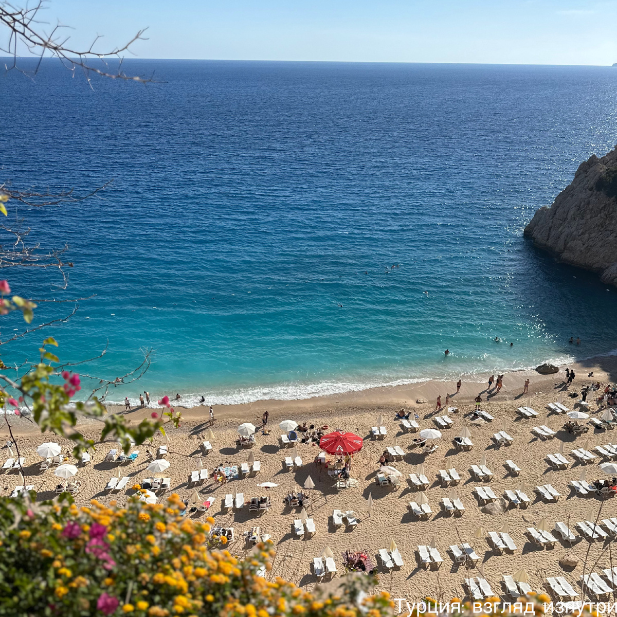 На юго-западном побережье Турции, между двумя живописными городками — Кашем и Калканом — раскинулся один из самых красивых пляжей мира — пляж Капуташ. Это место притягивает туристов и фотографов со всего мира: бирюзовая вода, желто-белый песок и величественные скалы здесь выглядят как кадр с открытки. Пляж Капуташ расположен в устье одноимённого каньона, откуда в море впадают ледяные родниковые воды. Проходя естественную фильтрацию сквозь песок, они придают морю удивительный бирюзовый оттенок и дарят освежающую прохладу даже в самые знойные летние дни. Вся красота пляжа открывается с высоты — со стороны дороги. Вид сверху буквально захватывает дух. Чтобы добраться до воды, нужно спуститься по 187 ступенькам. На пляже можно арендовать лежаки, перекусить в кафе, воспользоваться душем и туалетом. Говорят, особенно красиво здесь на закате — когда солнце окрашивает небо в розово-оранжевые оттенки, отражающиеся в прозрачной воде. Но я могу сказать, что пляж Капуташ прекрасен в любое время с