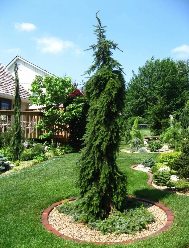 Как-то я рассказывала о чудесной ели Сербской Pendula, которая элегантная узкая с плакучими ветвями. И о той, что совершенно изгибается, прямо долу можно сказать, тоже ель сербская Pendula Bruns. Одирн из наиболее известных и распространенных вариантов елей с лакучей формой кроны - ель обыкновенная Пендула (Picea abies Pendula). Эта ель имеет неправильную форму кроны, которая в значительной степени зависит от способа формирования. Среди елей данного сорта встречаются экземпляры, как имеющие сформированный выраженный ствол, так и не имеющие его. Если не закреплять ведущий побег к опоре, то растение не будет расти вверх и станет почвопокровным. В ином случае она может достигать 5 м в высоту. Интересным фактом является то, что растение не имеет центрального ствола. Его формируют, выбирая из множественных побегов, и привязывают к опоре.