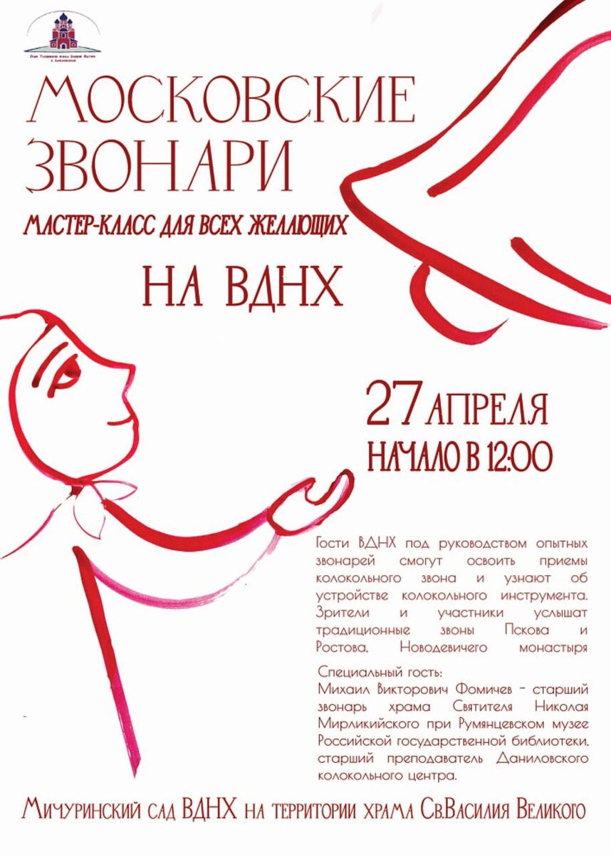 🆓 Колокольный мастер-класс на ВДНХ 🗓️27 апреля в 12:00 📍Мичуринский сад ВДНХ Гости ВДНХ под руководством опытных звонарей смогут освоить приемы колокольного звона и узнают об устройстве колокольного инструмента. Зрители и участники услышат традиционные звоны Пскова и Ростова, Новодевичего монастыря и Троице-Сергиевой лавры. Специальный гость: Михаил Викторович Фомичев — Старший звонарь храма Святителя Николая Мирликийского при Румянцевском музее Российской государственной библиотеки, старший преподаватель Даниловского колокольного центра. 🆓Бесплатно Подробнее ЗДЕСЬ 👨👩👧👦 @Together_with_kids Пост носит информационный характер