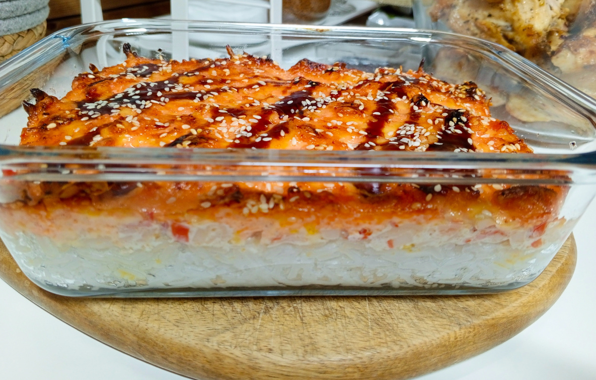 И суши мы теперь не заказываем. Нам очень даже зашла запеканка. Рецептов суши-запеканки на просторах интернета много, конечно. Начинки разные, мы тоже пробовали экспериментировать. Вкусно. А вот мой немного изменённый вариант. Отвариваю рис, у меня басмити, другого не было и не надо даже. Люблю его. И в запеканке он вполне хорош. Так вот, потом остужаю и добавляю рисовый уксус по вкусу. Чуть кисленький должен получиться в итоге рис. Соль не добавляю. Затем перемешиваю массу и выкладываю в форму для запекания. И обязательно ложкой притопите рис, чтоб тесно ему было, плотненько он лёг, ровным слоем. Второй "этаж" - крабовые калочки с добавлением пары ложек майонеза. Мои палочки были подороже, которые на волокна легко разделяются вилкой. Поняли какие? Да, ещё добавляю устричный или соевый соус чуток. И вновь перемешиваю и распределяю по форме. Затем третий слой из икры мойвы. Подкопчённой. Банку прям берите. Я в КБ покупаю. И добавляю сыр на тёрке. "Российский" подойдёт, "Ламбер" тож