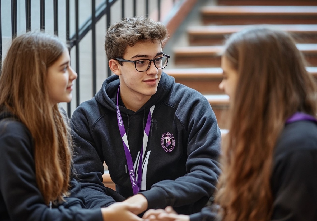 Создано на основе запроса: A young man wearing glasses and a campus lanyard is sitting on the stairs of his school next to two girls talking. He wears a black sweatshirt with white stripes. They wear long-sleeved uniforms in a dark blue color with purple accents and white emblems or logos. The photo was taken in the style of Canon EOS R5. --- Автоперевод: Молодой человек в бокалах и в кампусе лежат на лестнице его школы рядом с двумя девушками. Как тебе эта генерация? 🤔 https://dzen.ru/id/65c0c65c86e4f837c27b24d7 #ИИ #AI #нейросеть #midjourney #art