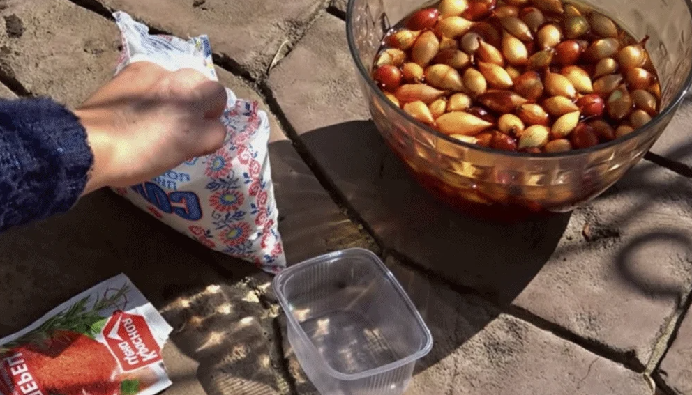 Вот тут начинается магия. Берём обычный нашатырный спирт (10%). Да-да, аптечный. Разводим: 1 столовую ложку на литр тёплой воды. Замачиваем туда луковицы минут на 20–30. Пусть постоят, согреются, пропитаются.