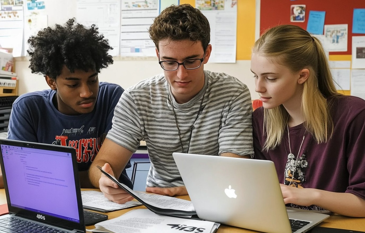 Создано на основе запроса: Photograph of three high school students and their teacher working on laptops in an English class. The young man is white with brown hair, wearing glasses, and dressed casually. He's looking at his laptop screen while showing something to two other teenagers who appear to be from different ethnic backgrounds. One has a dark skin tone, short black curly hair, and blue eyes, and is wearing a striped shirt. The other teenager looks very kind and nice-looking, with long, straight, blonde hair. He's holding some paper that says "40s". --- Автоперевод: Фотография трех старшеклассников и их учителей, работающих на ноутбуках в уроке английского языка. Как тебе это изображение? 🤔 https://dzen.ru/id/65c0c65c86e4f837c27b24d7 #ИИ #AI #нейросеть #midjourney #art