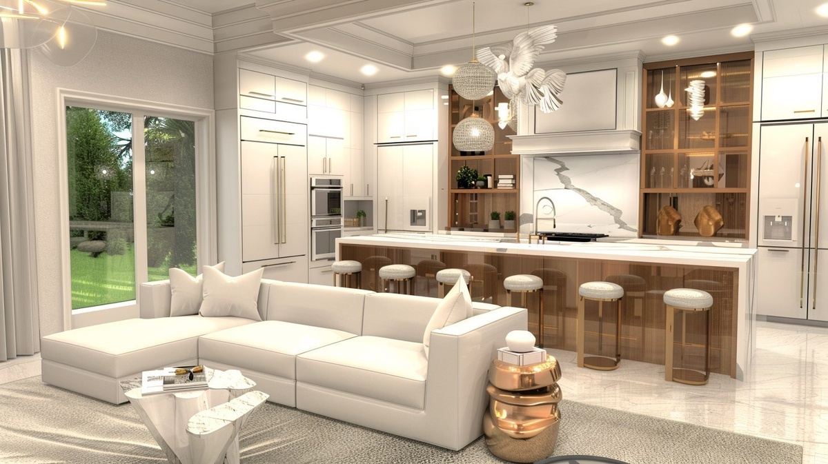 Создано на основе запроса: Open-concept modern luxury living room connected to an American-style kitchen and marble bar, the white angelic