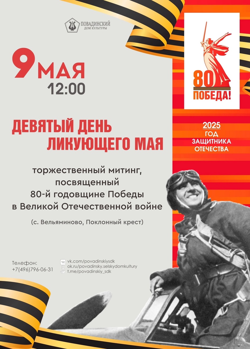 ✨ 🪖Как много ужасов принесла с собой Великая Отечественная война. Как много жизней и семей было порушено, горов разрушено. Долг современного поколения - помнить наших защитников, знать их подвиг и не забывать об ужасах страшного слова «слова». Мы приглашаем жителей с. Вельяминово на торжественный митинг «Девятый день ликующего мая», чтобы почтить память солдат, тружеников тыла, заключенных концлагерей, детей войны и ознаменовать величие мирного неба над головой🪖 📆 09.05.2025🕒12:00 🏢 Повадинский сельский дом культуры (СДК) 📍 г.о.Домодедово, с.Вельяминово, 10, Центральная площадь ✅ Мероприятия Домодедово https://dzen.ru/id/66f10385cc4c5a16f7b5fb02 http://vk.com/domodedovo_events http://dzen.ru/domodedovo_events