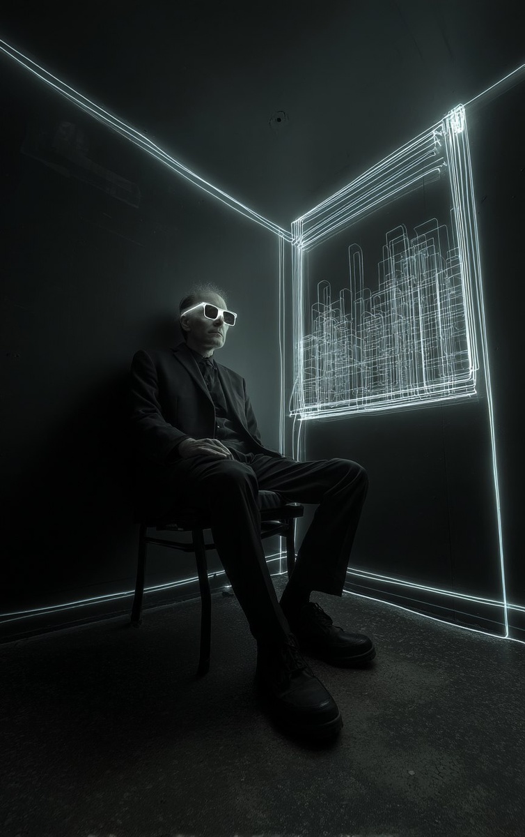 Создано на основе запроса: a man sits in a small black room with black walls on a black chair, there is a very small window where there is a city of Ecumenopolis world, the man is dressed in a black suit and dark sunglasses, Digital Art, Light Art, Sparkly, Electroluminescent Wire --- Автоперевод: Мужчина сидит в маленькой черной комнате с черными стенами на черном стуле, есть очень маленькое окно, где есть город Экуменисского мира, человек одет в черный костюм и темные солнцезащитные очки, цифровое искусство, легкое искусство, блестящее, электролюминесцентное проволоку Как тебе эта картинка? 🤔 https://dzen.ru/id/65c0c65c86e4f837c27b24d7 #ИИ #AI #нейросеть #midjourney #art
