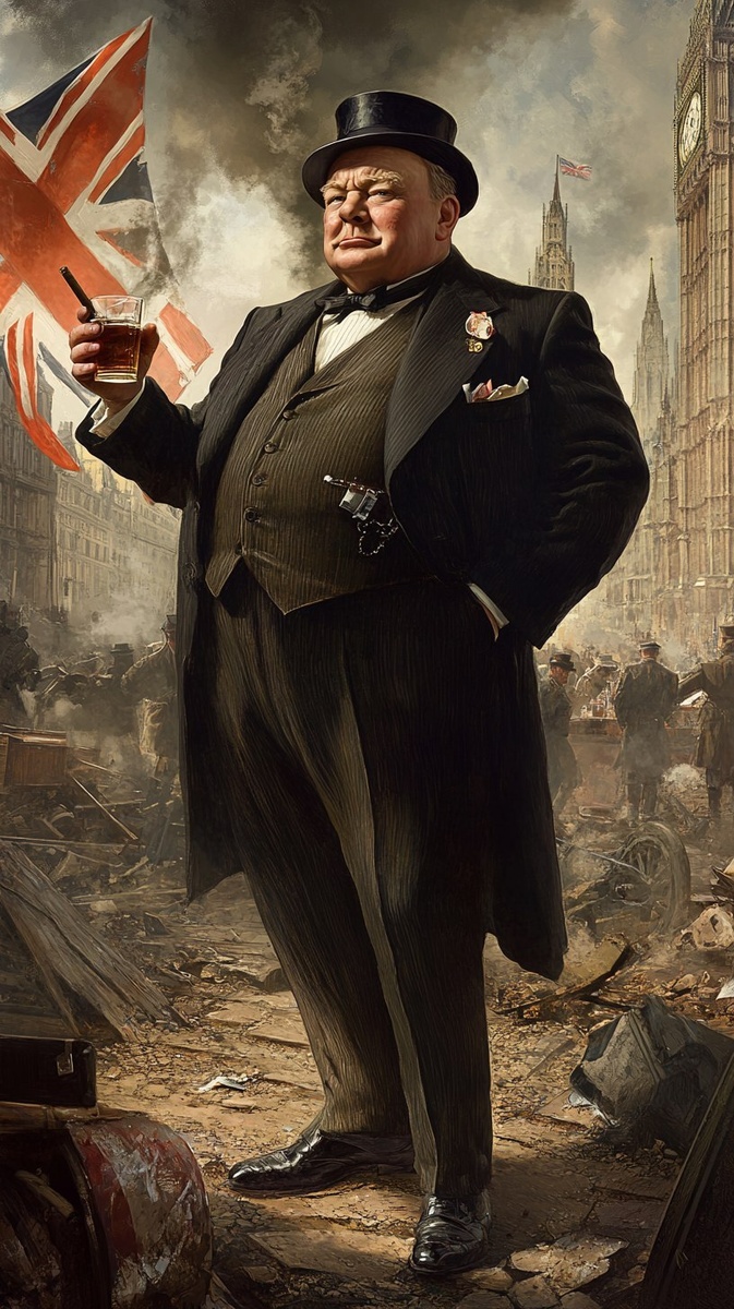 Создано на основе запроса: Winston Churchill standing confidently amid post-blitz London ruins, holding a cigar and a glass of whisky, British flag in the background, slight smile on his face, gritty but triumphant tone, vertical format --- Автоперевод: Уинстон Черчилль, стоящий уверенно среди руин после Блица, держа сигару и бокал виски, британский флаж Красиво вышло? 🤔 https://dzen.ru/id/65c0c65c86e4f837c27b24d7 #ИИ #AI #нейросеть #midjourney #art