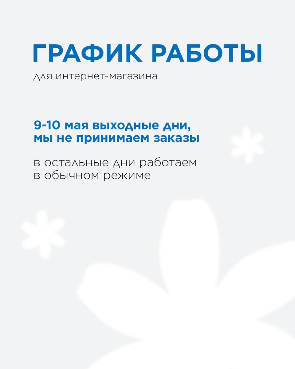 С 29 апреля по 11 мая у нас изменится график работы интернет-магазина и отгрузки для оптовых партнеров