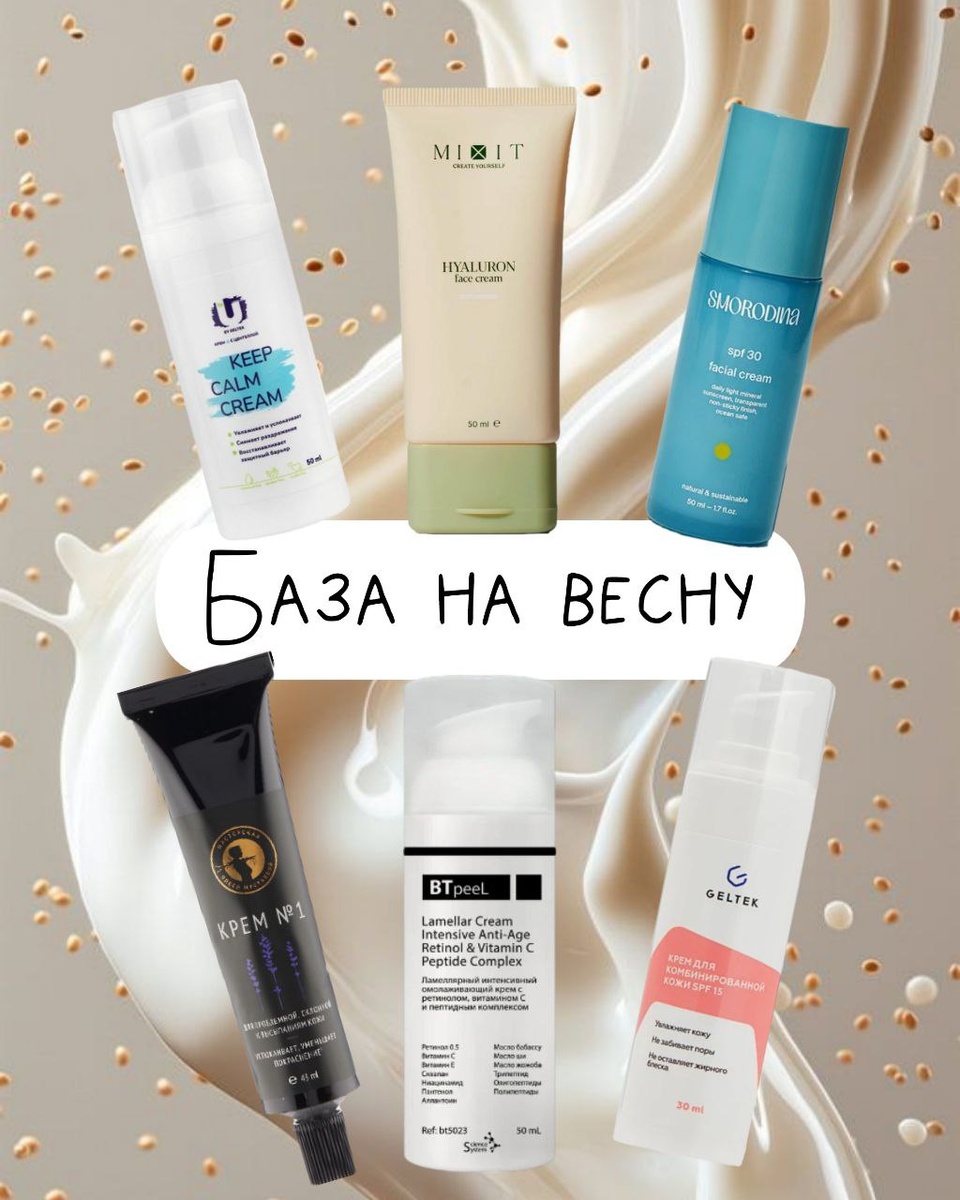 Базовая база на весну: лёгкие кремы, на которые можно «наслоить» всё что угодно Сильные активы требуют мягкой базы, которая будет поддерживать кожу без перегрузки. Я собрала для вас проверенные кремы, которые отлично работают сами по себе и прекрасно сочетаются с сыворотками, кислотами, ретинолом и другими активами: • BTpeeL ламеллярный интенсивный омолаживающий крем — с ретинолом, витамином С и пептидным комплексом. Отличный вариант для возрастного ухода и деликатного омоложения • Гельтек дневной увлажняющий крем для комбинированной кожи с SPF 15 — лёгкий, с гиалуронкой, алоэ и пантенолом. Отлично подойдёт на день, особенно в городских условиях • Mixit увлажняющий крем для лица — ламеллярная текстура с гиалуроновой кислотой. Идеален в качестве базы под активы или просто как лёгкий увлажняющий крем • The U успокаивающий крем с центеллой Keep Calm Cream — спасение для чувствительной и раздражённой кожи, особенно после кислот и ретинола • Мастерская Олеси Мустаевой крем №1 — для ко