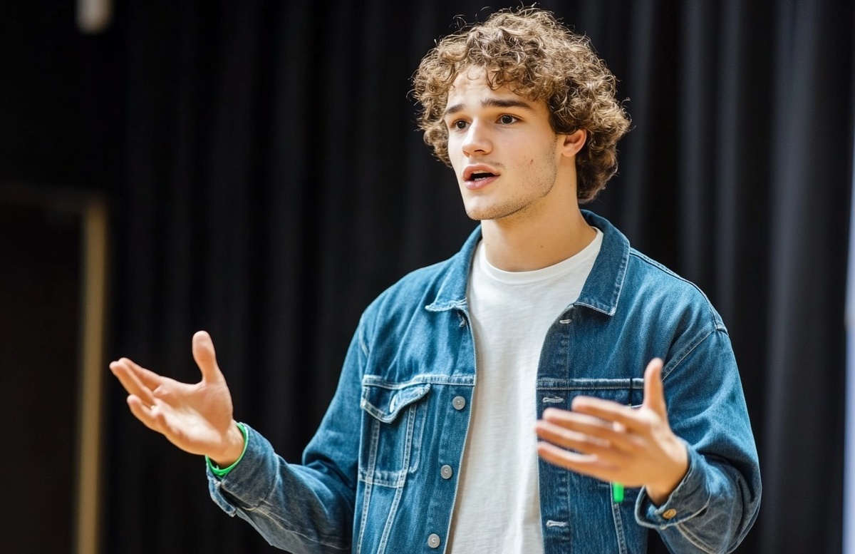 Создано на основе запроса: A young man with curly hair and a blue denim jacket is giving an outline of his presentation to students at the university. He holds out hand gestures while speaking in front of them on stage. The background features black curtains and white walls, creating a modern atmosphere. He wears a plain T-shirt underneath his shirt, adding some casualness to his appearance. A green pen hangs from one corner of his left pocket, indicating that he may have just finished writing something down. --- Автоперевод: Молодой человек с вьющимися волосами и синей джинсовой курткой дает наброски своей презентации студентам в университете. Какое твое мнение? 🤔 https://dzen.ru/id/65c0c65c86e4f837c27b24d7 #ИИ #AI #нейросеть #midjourney #art