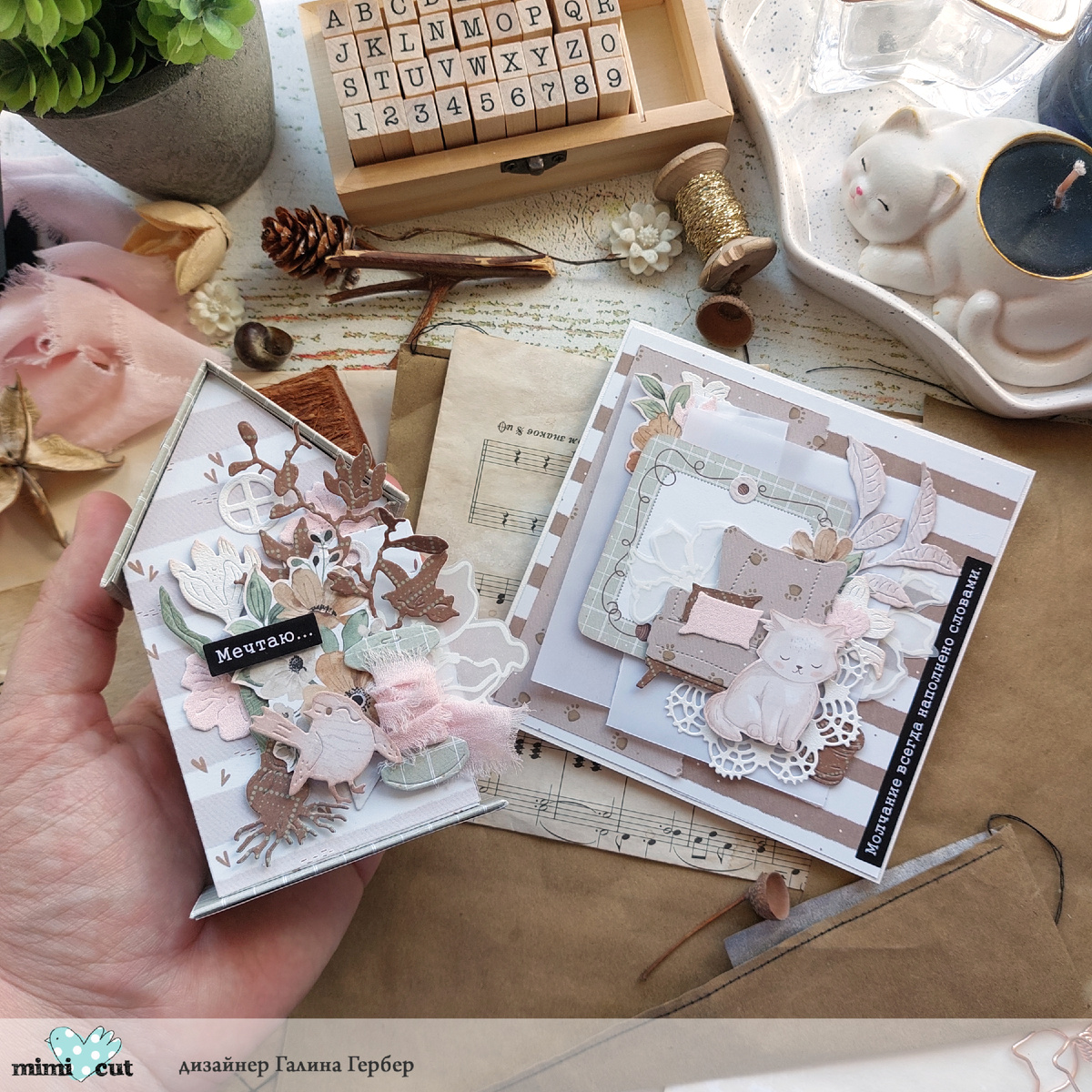 Всем привет! С вами Галя. Сегодня на очереди милая парочка, которую я подружила в своих работах. В качестве подарка на день рождения маленького друга я сделала коробочку-домик и открытку. Домик-скворечник для прекрасной птички Mimicut создан с помощью ножа "Дверь полуоткрыта". Фасад украшен цветами ("Вершки и корешки", "Весне дорогу"). Также я добавила флажок из сета "Ценная коробочка" и катушку ("Курсы кройки и шитья") с нежно-розовой креп-сатиновой лентой. В основе работ коллекция "Весёлые хвостики" от Paper Home. Нежная веточка из сета "Дай мне руку" украшает кровлю. Внутрь домика можно спрятать сладости или карточку-сертификат. В компанию к домику подготовила открытку. Здесь главный герой - котик. В оформлении открытки мне помогали следующие сеты Mimicut: "Шумят сады зеленым телеграфом", "Про отдых", "Связано крючком". Спинка и внутреннее наполнение в моём любимом минималистичном стиле. Нож "Строчка за строчкой", который я пустила по краю, стал особой изюминкой. Смотрится очень не