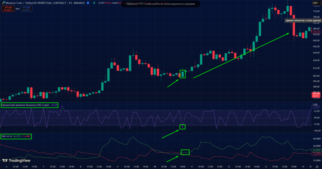 В трейдинге важно не только находить моменты перекупленности/перепроданности, но и определять силу тренда. Williams %R поможет вам выявить зоны разворота, а DMI (Directional Movement Index) покажет силу и направление движения цены. В этой статье мы расскажем, как использовать эти индикаторы вместе для достижения лучших торговых результатов. 💡 Williams %R — ваш инструмент для поиска точек разворота, а DMI — помощник в оценке силы тренда. Давайте разберемся, как они работают в тандеме в TradingView! Williams %R — это осциллятор, который измеряет уровень перекупленности и перепроданности. 💡 В TradingView Williams %R легко добавить на график через вкладку “Индикаторы”. Значения выше -20 указывают на перекупленность, а ниже -80 — на перепроданность. 🎯 Этот индикатор особенно полезен для трейдеров, которые хотят находить точки разворота цены. DMI (Directional Movement Index) — это индикатор, который показывает силу и направление тренда. Он состоит из трех линий: 🎯 В TradingView DMI досту