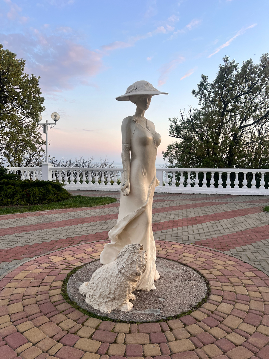 Выбрав хороший денечек (22 апреля), мы с дочкой решили прогуляться по набережной и зайти куда-нибудь перекусить. Сначала доехали до района Толстый мыс на Крымскую улицу и прошлись по скверику дамы с собачкой. Это очень хороший образец того, какими приятными могут быть гипсовые фигуры в парках и прогулочных зонах.