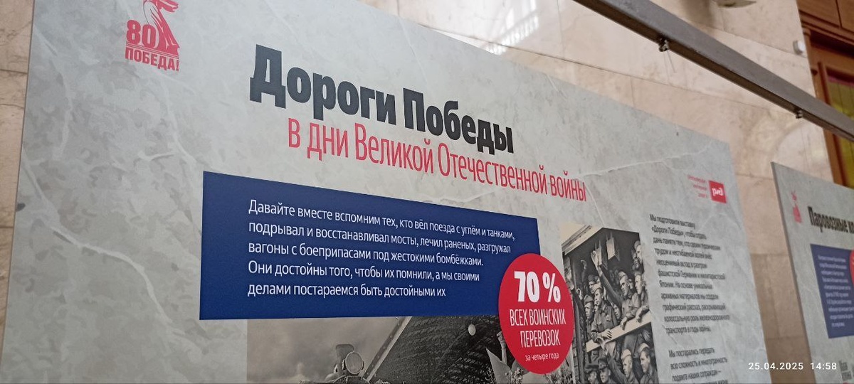 Дорогами Победы К 80-летнему юбилею Победы на двух вокзалах Брянск-Орловский и Рязань-2 открыли выставки «Дороги Победы». Архивные фото, карты, инфографика – все они рассказывают о роли стальных магистралей в годы Великой Отечественной войны. Экспонаты разделены на 10 блоков, в том числе – «Московская битва», «Эвакуация», «Блокада Ленинграда», «Сталинградская битва», «Курская дуга». Экспозиции будут открыты в течение всего 2025 года. В ближайшие дни аналогичные выставки начнут работать на вокзалах Калуги, Орла, Смоленска, Курска и Тулы. Подробнее
