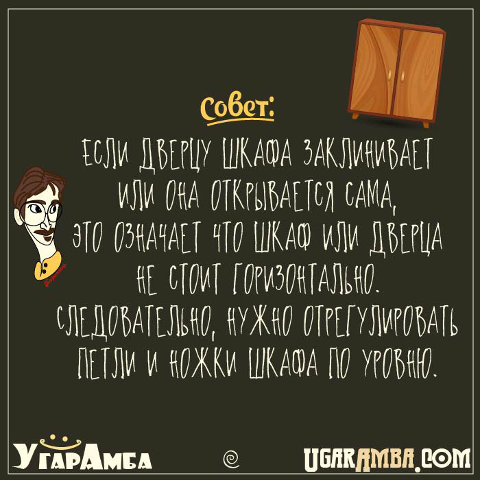 Если дверцу шкафа заклинивает или она открывается сама, это означает что шкаф или дверца не стоит горизонтально. Следовательно, нужно отрегулировать петли и ножки шкафа по уровню.
