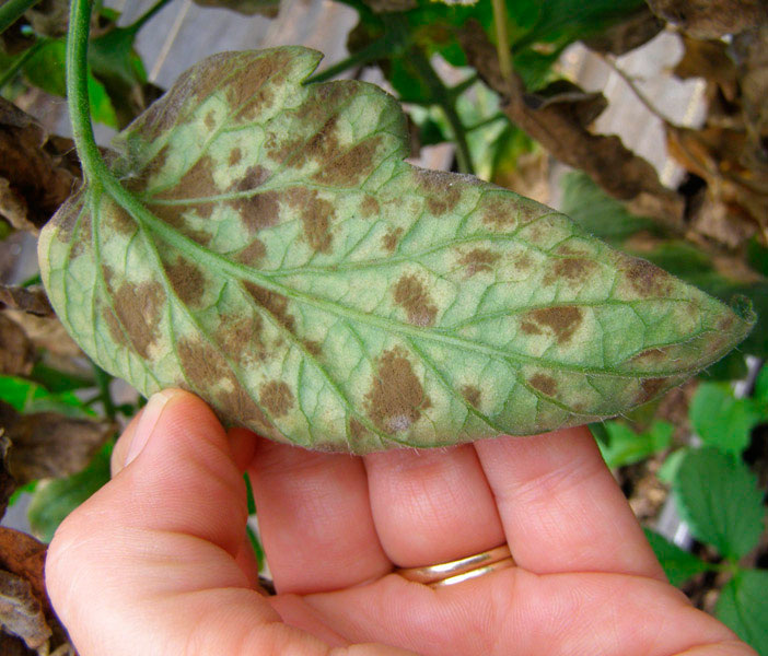 Кладоспориоз – недуг грибкового происхождения, устойчивый ко многим условиям. Его выведение осложняется как раз жизнестойкостью патогенных грибков. Они могут заселяться в самые укромные уголки теплиц и даже почву, перемещаясь в последствии на все части культурных растений. От того успешно бороться с бурой пятнистостью непросто, но возможно! Наиболее ярко кладоспориоз проявляется при температуре от +20 до +25 градусов, при высокой влажности. До этой идеальной для размножения спор поры, необходимо успеть выполнить комплекс мероприятий, направленных на профилактику или же протравливание имеющегося грибка. Первый раз теплицу следует обрабатывать при температуре от +5 градусов, после этапа уборки в ней и помывки конструкции. В качестве фунгицидного средства от бурой пятнистости можно использовать целевые препараты, имеющие пометку «От кладоспориоза». Аналогично достойно себя проявит хлорокись меди 40г на 10л, «Фитоспорин-М» 10г на 10л, «Топаз» 2мл на 10л, «Бордосская жидкость». Примеч