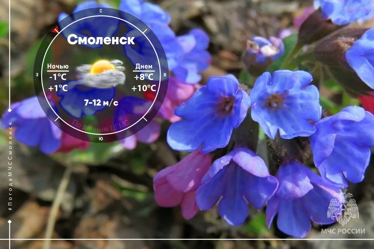 Ночью возможны заморозки 🥶 ⛅️ Завтра на территории Смоленской области ожидается переменная облачность. Без существенных осадков. Ветер будет дуть северо-западный со скоростью 7-12 м/с. 🌡Температура воздуха: - по области: ночью -3°C…+2°C, днем +6°C…+11°C; - в Смоленске: ночью -1°C…+1°C, днем +8°C…+10°C. ВНИМАНИЕ❗️❗️❗️ В ночные и утренние часы 26-28 апреля по территории Смоленской области ожидаются заморозки -5…0°С. 📌Обо всех изменениях в погоде смотри здесь. По народному календарю 26 апреля отмечается Фомаида Медуница. Назвали праздник так потому, что с этого дня начинает цвести растение. МЧС России напоминает: ✅ не поджигай сухую растительность, ✅ не сжигай мусор, лучше вывози его в контейнеры, ✅ пресекай шалости и хулиганские действия с огнем детей и подростков. @ГУ МЧС России по Смоленской области #МЧСРоссии #ПогодаСмоленск