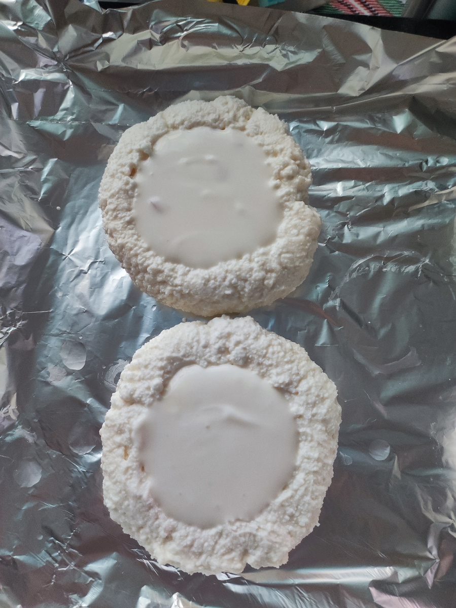 Ингредиенты для теста: - 2 яйца (1 целое + 1 белок для теста, 1 желток для смазки) - 250 г творога (у меня в брикетах) - сахзам (по необходимости) - с ним будет слаще, я готовила без него - ½ ч. л. разрыхлителя - Ванилин по вкусу - 70 г рисовой муки Для начинки: - Густой йогурт (греческий или натуральный) - Свежие фрукты (ягоды, груша, яблоко) или джем без сахара Приготовление: 1. Тесто: - В миске смешайте 1 целое яйцо + 1 белок, творог, разрыхлитель, ванилин и рисовую муку. - Замесите однородное тесто (оно будет мягким, но не липким). 2. Формирование ватрушек: - Разделите тесто на 3-4 части, скатайте шарики и выложите на противень с пекарской бумагой/фольгой. - Сделайте в каждом углубление пальцами, формируя бортики. 3. Начинка: - В углубления положите 1–2 ч. л. густого йогурта. - Сверху добавьте кусочки фруктов или ½ ч. л. джема без сахара. 4. Выпечка: - Смажьте бортики ватрушек оставшимся желтком (для румяной корочки). - Выпек