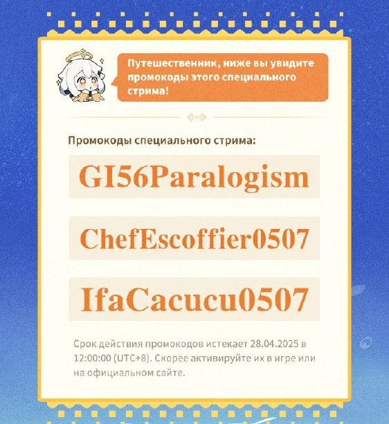 Геншинята, разбираем промокоды miHoYo провели стрим грядущего обновления 5.6 для Genshin Impact и дропнули три новых промокода: GI56Paralogism: 100 примогемов и 10 единиц Волшебной руды усиления; ChefEscoffier0507: 100 примогемов и 5 единиц Опыта героя; IfaCacucu0507: 100 примогемов и 50 тысяч моры. Активировать можно до 28 апреля 7:00 по МСК здесь. CtrlAltDelights- подписаться