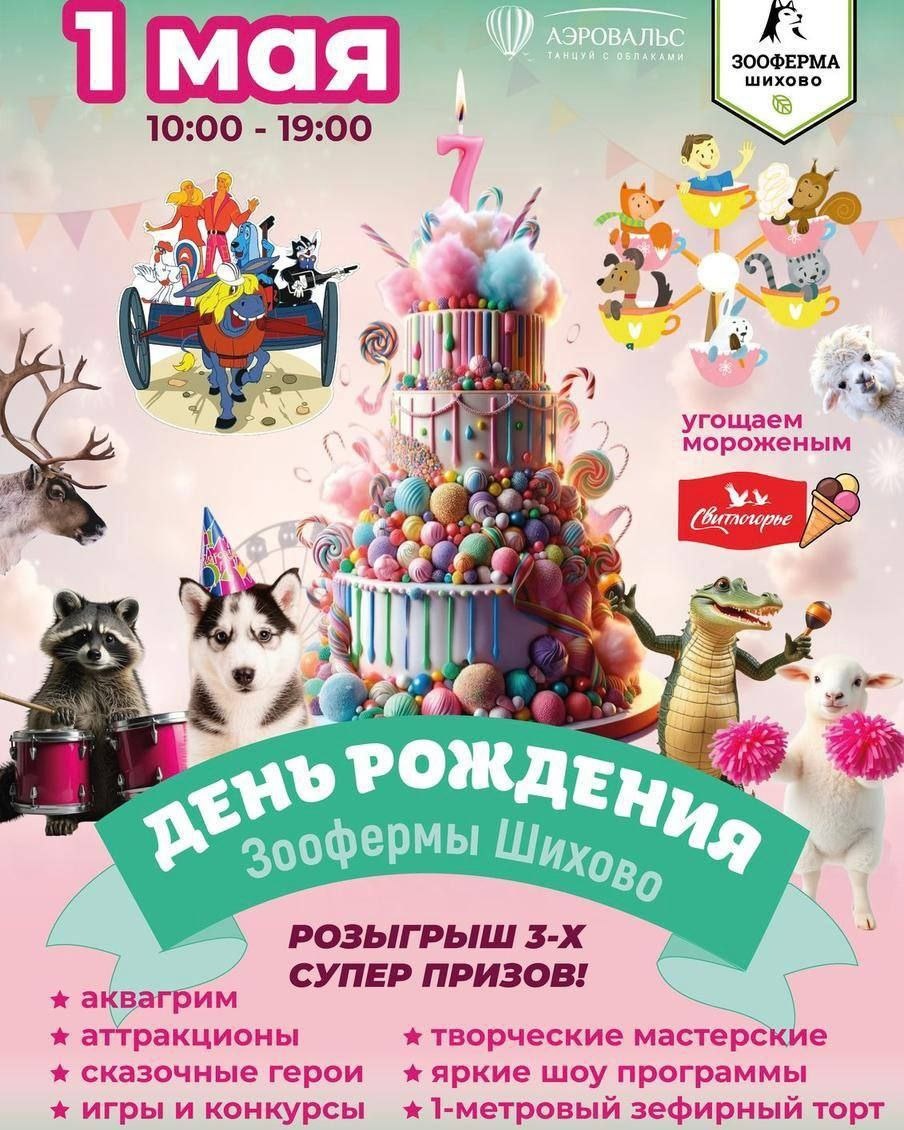 Приглашаем на День Рождения Зоофермы Шихово @parkshihovo Программа праздника самая насыщенная: - шоу барабанов - шоу чир-лидеров - марафон бесплатных мастер-классов - игровая программа «Бременские музыканты - общение с животными - экскурсии к оленям, хаски, ламам и ко всем остальным обитателям фермы. Угощать будем конечно же огромным тортом из зефира! Партнер Свитлогорье подарит детям самое вкусное эскимо! Среди всех посетителей Зоофермы Шихово @parkshihovo будут разыграны подарки: - бесплатный пожизненный абонемент на Зооферму Шихово - полет на воздушном шаре - большая корзина фермерских продуктов. Погрузитесь в волшебную атмосферу детства и праздника 🥳 Подробная АФИША ЗДЕСЬ Зооферма Шихово: МО, Дмитровский район, деревня Шихово, д. 100, стр. 1