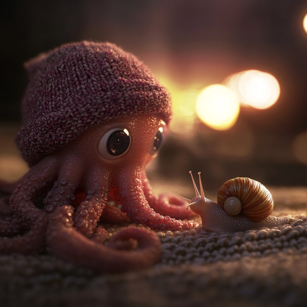 Создано на основе запроса: a detailed 3d animation style image of a cute octopus wearing a knit hat, staring happily at a small adorable snail who is also wearing a knit hat- v 6.1 --- Автоперевод: Подробное изображение в стиле 3D-анимации симпатичного осьминога с вязаной шляпой, счастливо глядя на маленькую восхитительную улитку, которая также носит вязаную шляпку- V 6.1 Хорошо выглядит? 🤔 https://dzen.ru/id/65c0c65c86e4f837c27b24d7 #ИИ #AI #нейросеть #midjourney #art