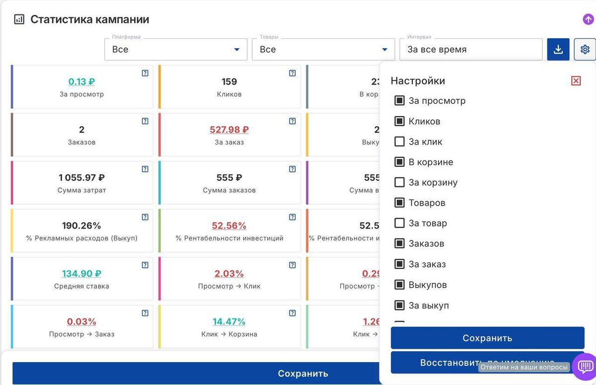 Прокачайте аналитику: настраиваемая статистика в вашем распоряжении 🚀 В MP Manager доступна продвинутая функция — настройка панели метрик в разделе “Статистика кампании”. Теперь вы сами решаете, какие показатели видеть в первую очередь. Больше не нужно отвлекаться на лишние данные — только то, что важно именно для вашего бизнеса. Что можно отслеживать: ✔️ Клики, просмотры, добавления в корзину ✔️ Заказы, выкупы, сумма затрат, сумма выкупов ✔️ Процент рекламных расходов от выкупов ✔️ ROI (рентабельность инвестиций) — в разрезе выкупов Конверсии: ✔️ из кликов в корзину, ✔️ из корзины в заказ, ✔️ из заказа в выкуп И многое другое 🔖Как использовать: В правом верхнем углу панели статистики рекламной кампании — значок настроек. Откройте его и выберите нужные метрики. Сохраняйте удобный вам набор и анализируйте результаты по своим правилам. Функция особенно полезна: • для сравнения эффективности разных кампаний, • при управлении большими каталогами товаров, • для оценки рентабельности