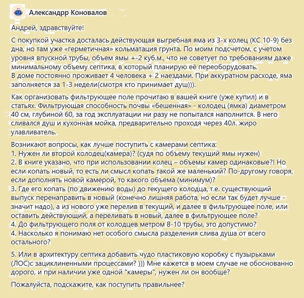 Меня тут упрекнули, что я, или моя помощница, пиара ради сочиняем вопросы подписчиков. То есть строго по Жванецкому: Вот список ваших вопросов, вот список моих ответов, причем четыре варианта по времени года. ... Том 1. Шестидесятые Михаил Жванецкий. Но нет, и я, и помощница, и все вопросы настоящие. Даже подружка помощницы из предыдущей статьи, и та настоящая, не поддельная: Так вот вопрос первый, вынесенный в заголовок этой статьи, который я для сохранения аутентичности не стал литературно обрабатывать и сокращать. Даю скрином: Как определить площадь поля можно почитать по ссылке ниже, хотя и книга будет отнюдь не бесполезна для дальнейшего конструирования поля: Теперь по пунктам: 1-3. Я бы вообще не трогал эту заилившуюся яму. Не сильно аппетитно в ней ковыряться, переделывая её в секцию септика. Пусть она будет дополнением к новому септику, предотстойником перед ним. Новый септик подключить уже после этой ямы. При этом, новый септик должен быть с рабочим объемом, равным трехсуточно