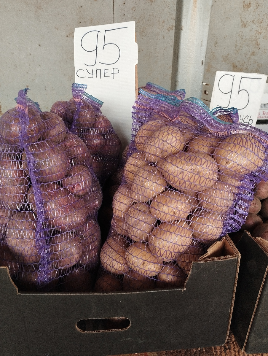 Вдохновила меня блогер из Санкт-Петербурга. Они удивила очень низкими ценами на овощи-фрукты на знаменитом Сенном рынке в северной столице, но написала, что там нельзя всё самому выбирать, а продавцы в пакет обязательно что-то гнилое суют. Очень странно. У нас подобного очень давно нет. Всё сам берёшь, кладёшь, сколько хочешь, а потом кладёшь на весы. А если что-то портится, то цену снижают. Вот так мне позавчера удалось купить больше килограмма цветной капусты всего по 50 рублей. А что почём сегодня? Уточню, в супермаркете можно купить картошку немного дешевле. Например, здесь: Ну, а у меня возле дома вчера была по 90 рублей отборная. Это молодая капуста, молодая картошка и огурцы. Самая дорогая и, как говорят, самая вкусная молодая картошка, конечно, уж слишком дорогая. Даже свиная лопатка для бульона стоит чуть дешевле. Морковка и болгарский перец. Ну, а вот и матрёшка. Оказывается, это не только исконно русская деревянная игрушка, которую так любят туристы, не только новый кулина