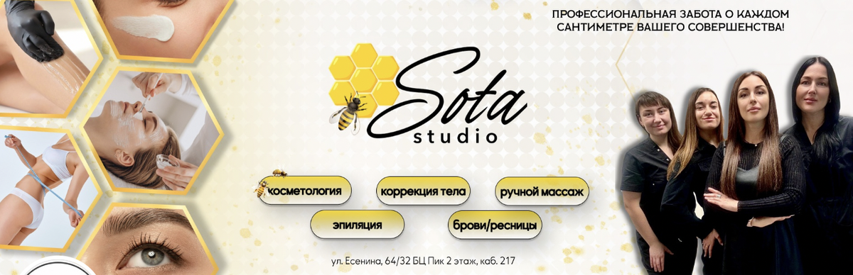 Бьюти студия Sota Studio-это организация, которая предлагает по-настоящему комплексный взгляд на красоту. От коррекции и окрашивания бровей до расслабляющего массажа - люди, считающие, что привлекательная внешность и здоровье тесно связаны, в полной мере оценят доступный здесь набор услуг.