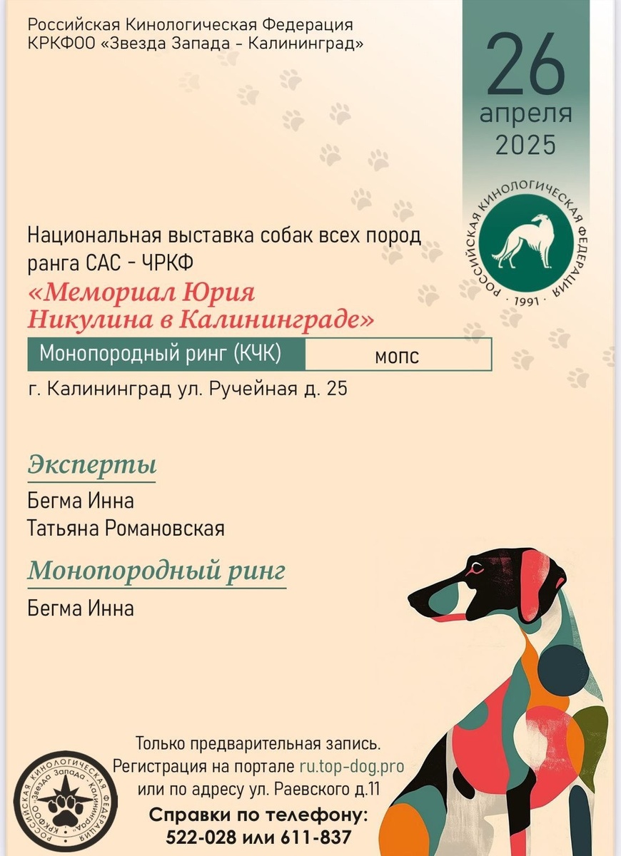 ⏰ 26 - 27 апр (1д) 🏛 #Калининград #Россия #Выставка 🐶 Выставка собак: Мемориал Юрия Никулина в Калининграде - 2025 🏆 Кинологический клуб "Звезда Запада-Калининград" Контакты организаторов здесь: 🌐 https://www.petsman.ru/vystavki-sobak.php?mesto=379-kaliningrad Национальная выставка собак всех пород «Мемориал Юрия Никулина в Калининграде - 2025» ранга САС - Чемпион РКФ Начало выставки в 10 ч 26.04.2025 Национальная выставка собак всех пород ранга САС - ЧРКФ CAC Чемпион РКФ Монопородная выставка клуб НКП "Мопс" Кандидат в чемпионы национального клуба породы Монопородная выставка клуба НКП "Уиппет" Кандидат в чемпионы национального клуба породы 27.04.2025 Монопородная выставка клуба НКП "Пинчер" Кандидат в чемпионы национального клуба породы Монопородная выставка клуба НКП "Стаффордширский бультерьер" Кандидат в чемпионы национального клуба породы Монопородная выставка клуба "Бультерьер" Кандида…