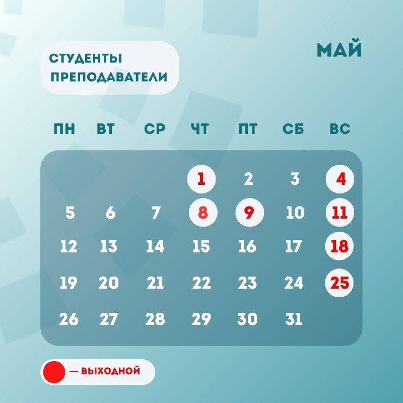 Друзья, сразу несколько хороших новостей! Завтра выходные, следующая неделя состоит из 3-х рабочих дней, а через 5 дней наступает май! 🌸 📅 Чтобы не запутаться в рабочих и выходных днях, ловите наши календари для тех, кто на шестидневке (студенты и преподаватели), и тех, кто на пятидневке (сотрудники). @rgusocteh