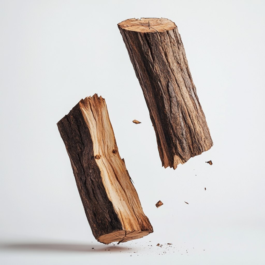 Создано на основе запроса: hyper realistic, a vertial log that has been split in half, and the two halfs are both falling down, against a