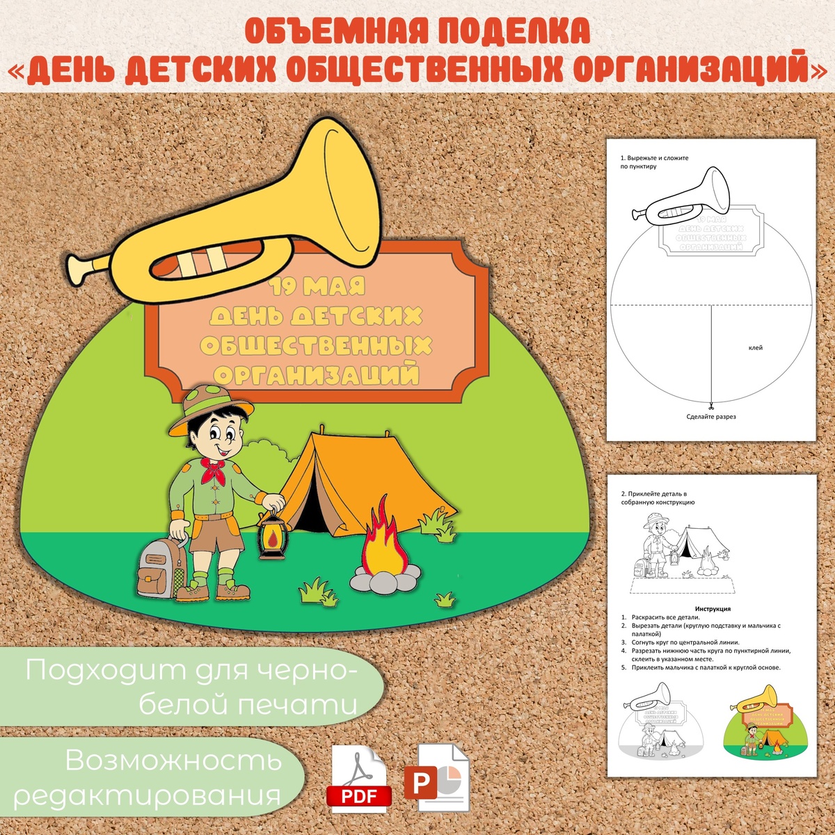 Поделка «День детских общественных организаций» (19 мая). Подойдет и для «Разговоров о важном» на тему «Жизнь в движении». Материал содержит шаблоны для изготовления объемной поделки и инструкцию по её изготовлению. Файл в формате PDF и PPTX. Есть возможность редактирования. Каждая деталь в формате png. Можно менять размеры всех деталей.