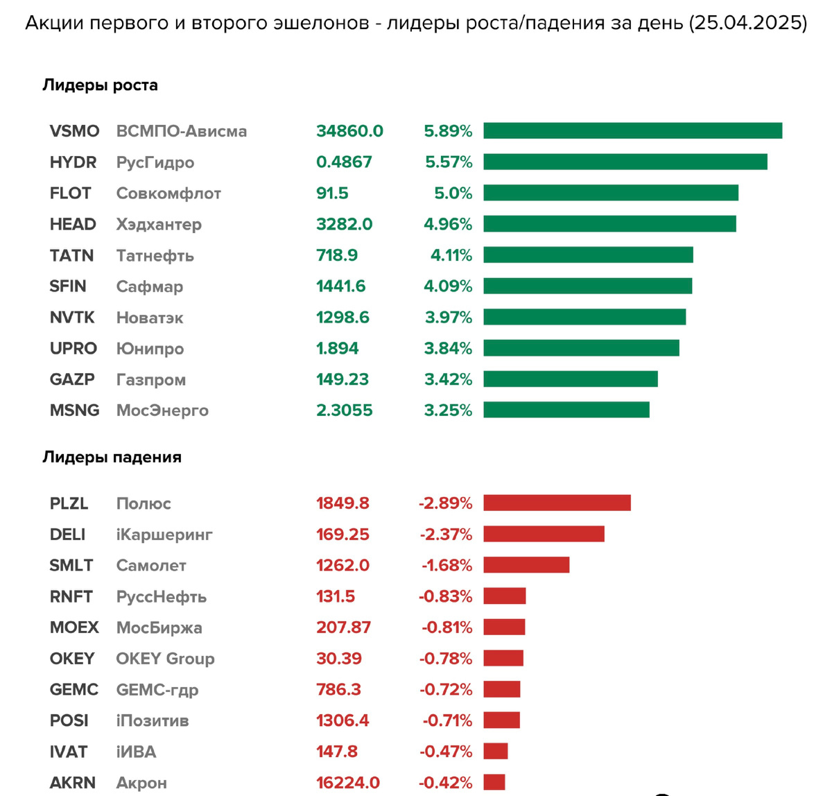 Всем привет! По итогам основной сессии 25 апреля индекс Московской биржи прибавил более 2% и превысил 3000 пунктов. Рост вызван как смягчением риторики ЦБ, так и очередным визитом Уиткофа. То есть мы вернулись на уровни начала апреля отыграв падение на новостях о пошлинах Трампа. Кто прислушался и докупал в тот момент акции поздравляю как минимум с 10% ростом. Валюта продолжает болтаться на уровнях минимумов года. Нефть торгуется выше 66 дол/барр. МТС Банк прокомментировал, что допэмиссия предполгается с премией к рынку и с параметрами банк определится уже в июне: Сегодня всех удивила Пермьэнергосбыт объявив приличные дивиденды за счет дополнительного распределения прибыли прошлых лет. Как всегда начинаешь потом кусать локти, что не смог купить их раньше и дешевле. Ну, значит не судьба. А вот Роснефть инвесторов огорчила. Всего 3% ДД: В связи с приближением праздников напоминаю как будет работать биржа: Еще раз напоминаю про акции банков и брокеров, которые завершаться в апреле - не