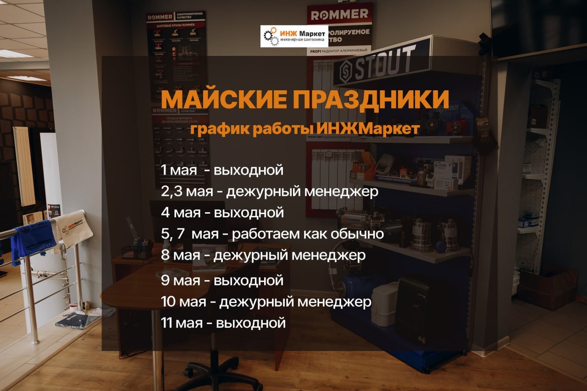 ‼️ График актуален для филиалов в Крыму. Н. Новгород и Тула - рабочие и выходные дни по производственному календарю‼️ 1 мая – выходной 2–3 мая – дежурные менеджеры 4 мая – выходной 5–7 мая – работаем в обычном режиме 8 мая – дежурные менеджеры 9 мая – выходной 10 мая – дежурные менеджеры 11 мая – выходной Наши дежурные сотрудники будут готовы помочь по срочным срочным вопросам с 9.00 до 13.00ч #ИНЖМаркет #ГрафикРаботы #МайскиеПраздники