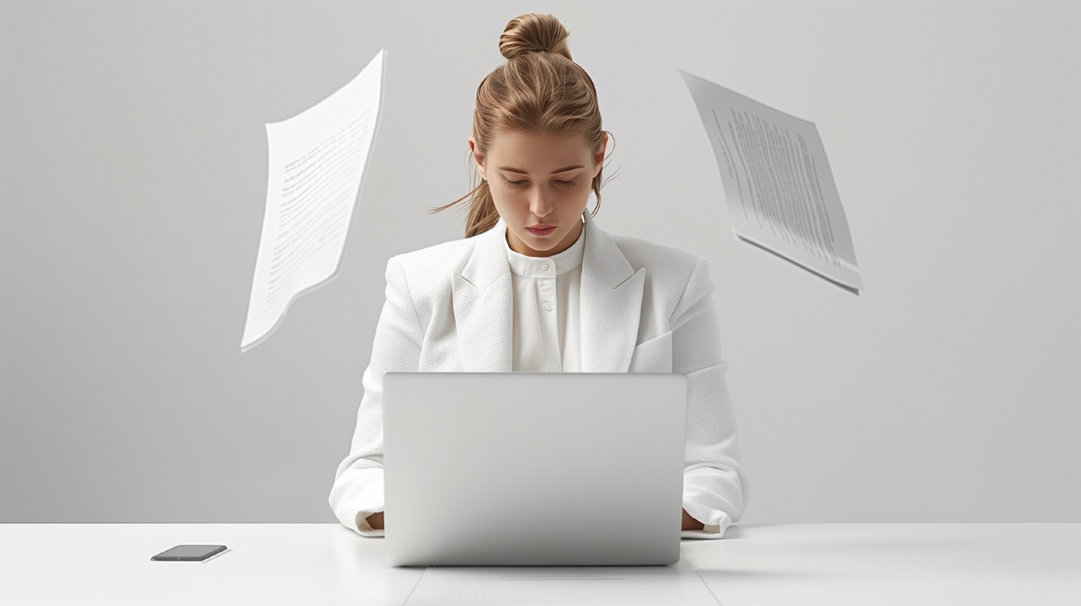 Создано на основе запроса: Realistic young woman in a white blazer, over-the-shoulder view, typing on laptop. Two documents floating in front of her. Clean white background, natural light, detailed skin, Canon EOS R5