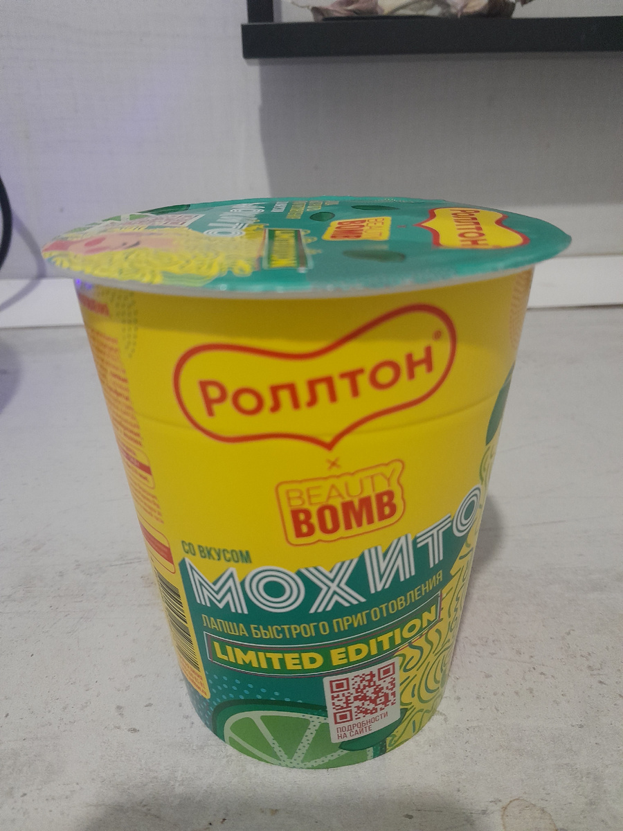 Повидал всякое, но Роллтон со вкусом Мохито вижу впервые. Как? Как такое сочетание могло придти в голову человеку? Увидел в магазине, естественно купил и дегустирую. Аж страшно. На внешний вид не очень. Запаха нет вообще. Так же отсутствует соевое мясо в шариках, сушёные овощи, и пакетик с маслом. Заливаю кипятком и даю настояться. Зеленоватая жижица. Аромат есть, но странный, но почему так станет понятно позже. Когда попробую. Ну вот он и готов. Лапша в зелёном рассоле. Пробую. Лапша классическая. И вот тут начинается самое не хорошее. Сначала идёт вкус лайма и мяты как в коктейле. А потом на первый план выходит вкус классической лапши и при этом догоняет лайм. Сочетание которого не может просто быть. Даже не знаю как передать ощущения от вкуса, это дикость. Сладковатая яичная лапша с мятой! Купил чтобы попробовать. Больше не возьму. Но стоит сказать производителю спасибо за эксперимент, настроение поднял и на работе тему для обсуждения. Вообщем это нужно пробовать. Хотя бы для н